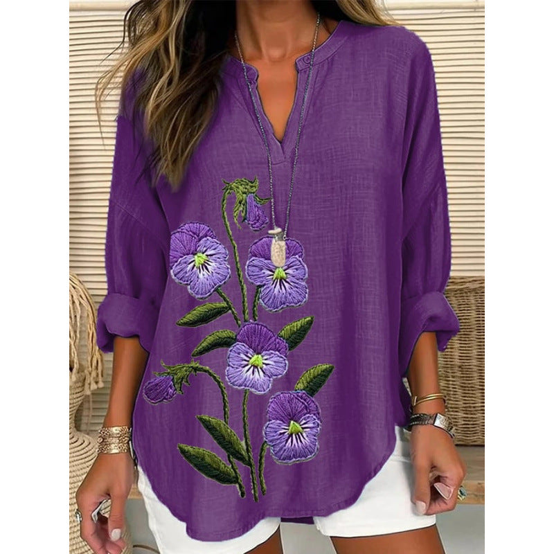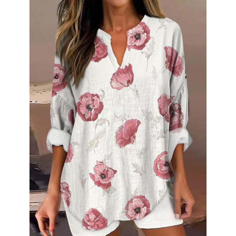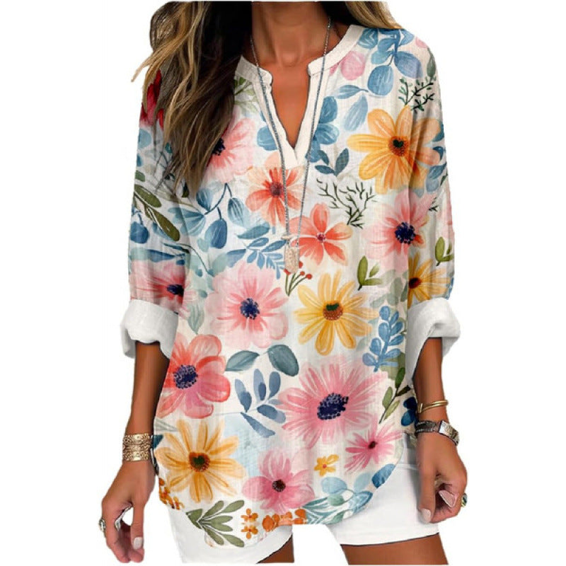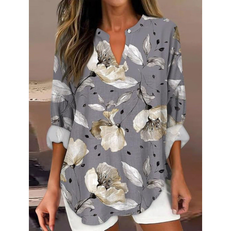 Elegancka damska koszula z nadrukiem, z dekoltem w szpic i długimi rękawami