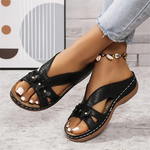 EFORTLESS STYLE MEETS COMFORT- Kwiecista cholewka z PU łączy się z amortyzującą gumową podeszwą, zapewniając komfort przez cały dzień. Wsuwana konstrukcja zapewnia bezproblemowe noszenie, a otwarty palec u nogi dodaje przewiewnego wyrafinowania. Idealne na spacery, brunche lub dni na plaży - szyk bez wysiłku na każdym kroku.