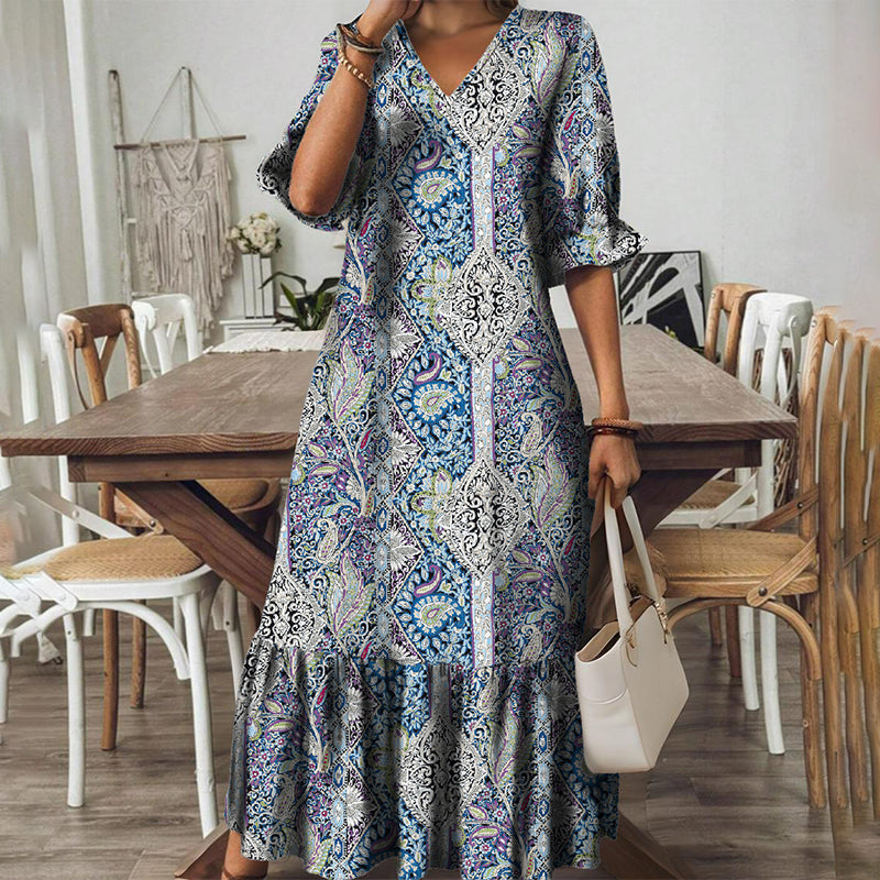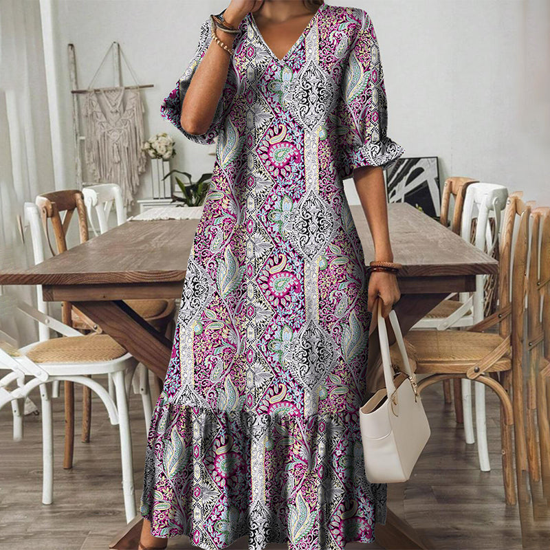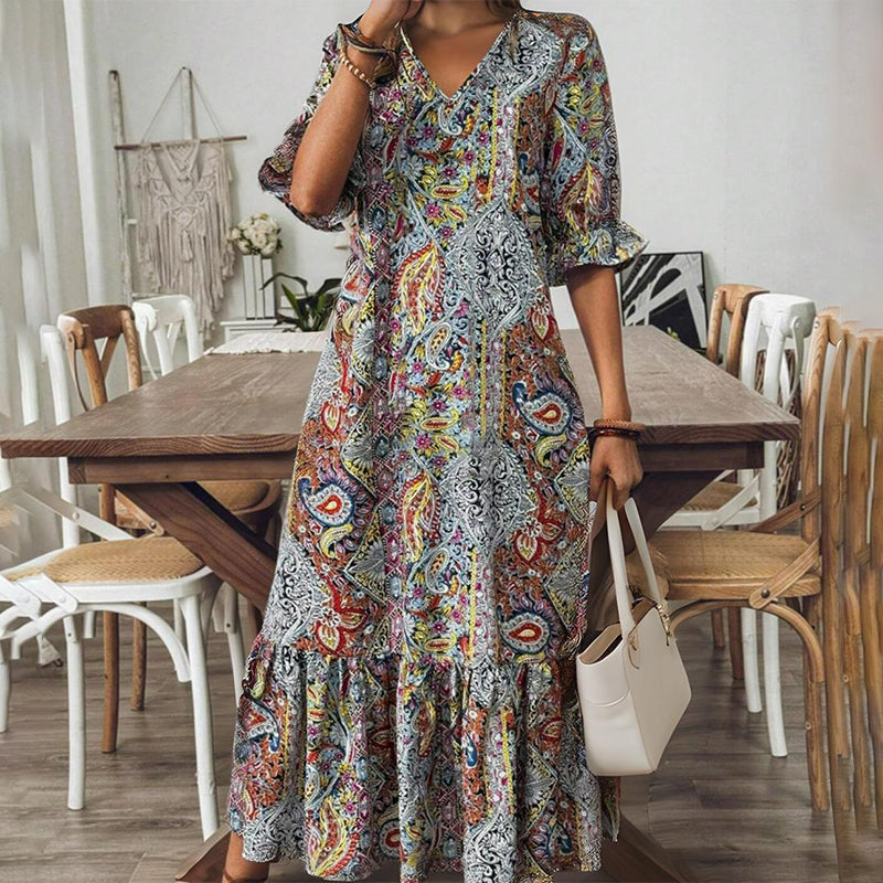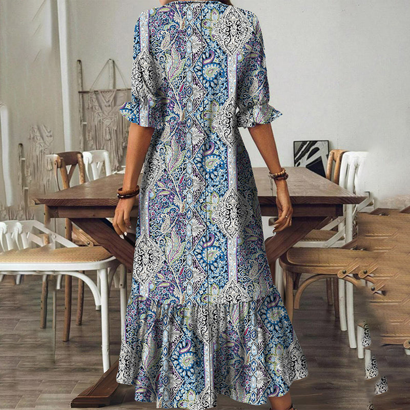 Etniczne nadruki: Żywe nadruki na tej sukience są kolorowe, harmonijne i etniczne, emanując artystycznym talentem i globalnym urokiem. Odważny, przyciągający wzrok design pokazuje osobowość i pewność siebie, dzięki czemu jest to uderzający element.