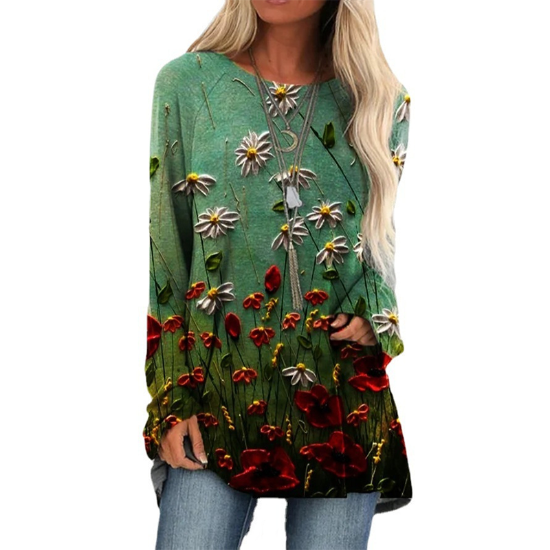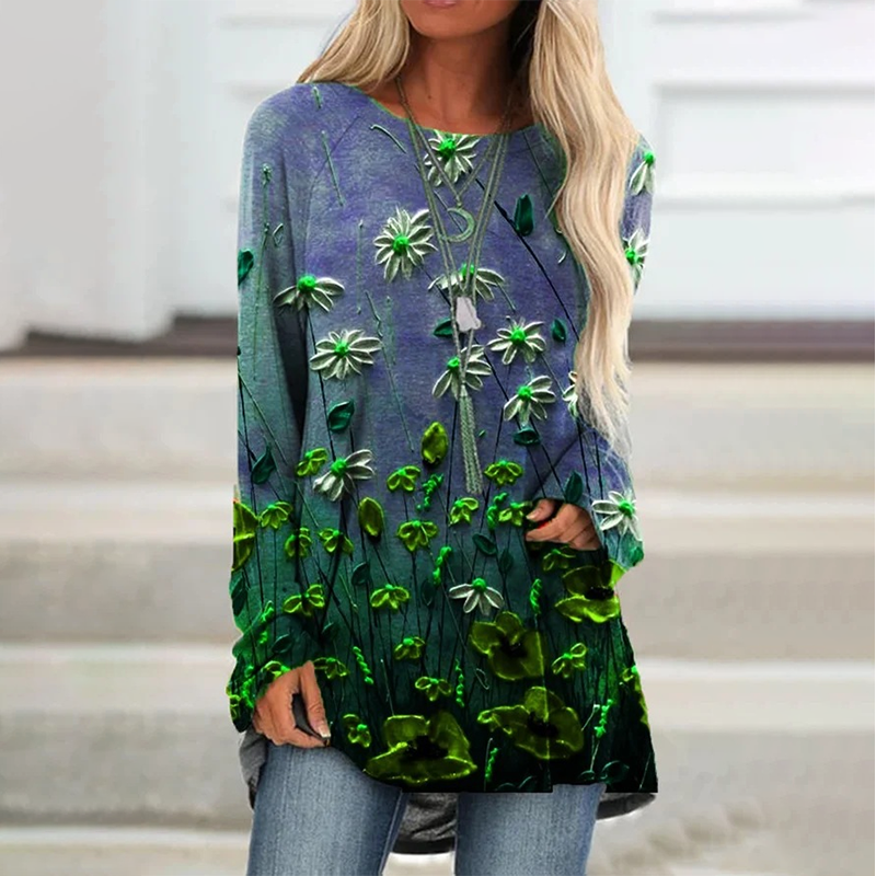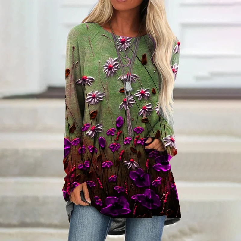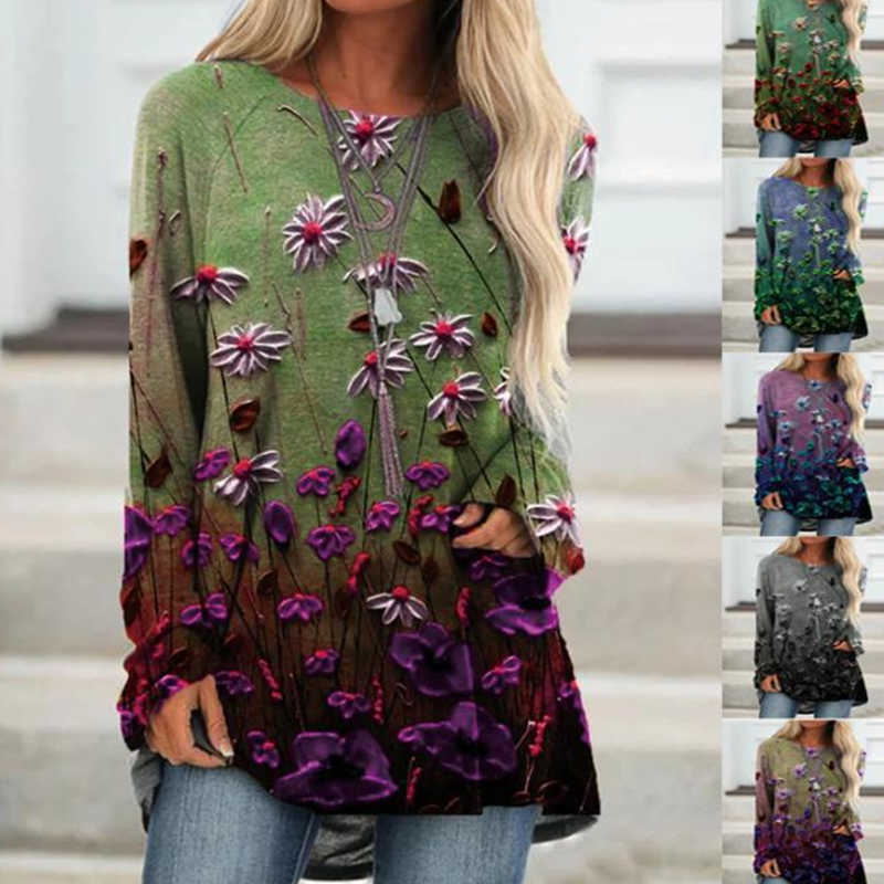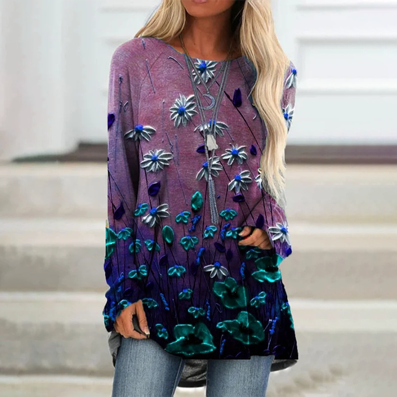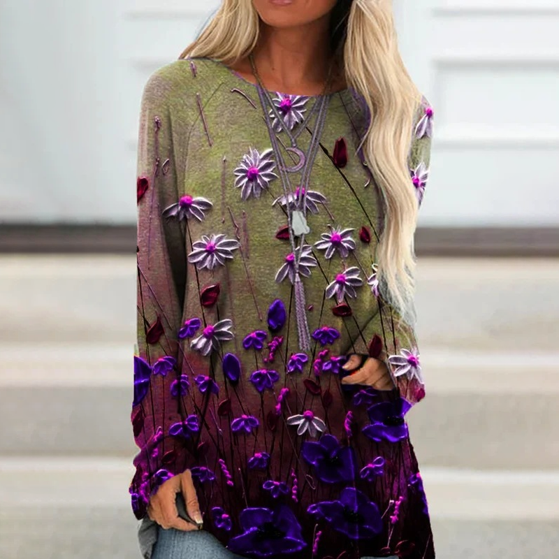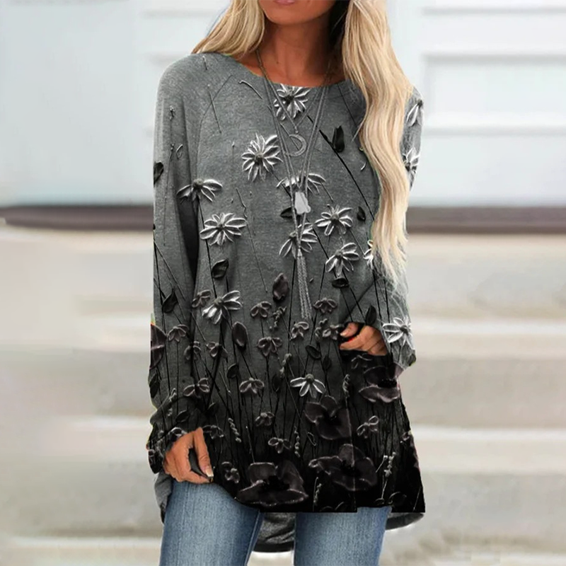 Elegancka, luźna bluzka z długim rękawem i nadrukiem
