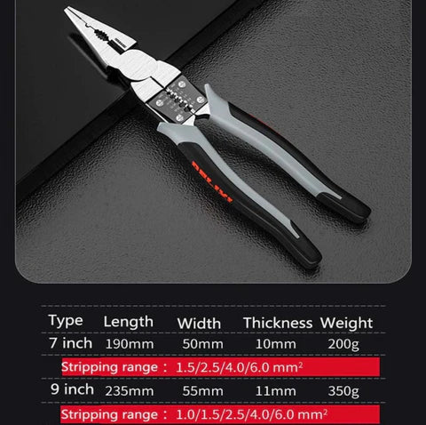 Szczypce wielofunkcyjne – narzędzie to pełni funkcję ściągacza izolacji, a jednocześnie służy jako nożyce do kabli i szczypce. Ściągacz izolacji można odłączyć za pomocą śrubokręta. Narzędzie umożliwia cięcie gwoździ o długości 3 cali oraz lin stalowych o przekroju 4², 6² i 8², a także ściąganie izolacji z przewodów elektrycznych o przekroju 1,0², 1,5², 2,5², 4² i 6².