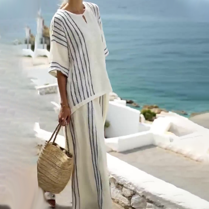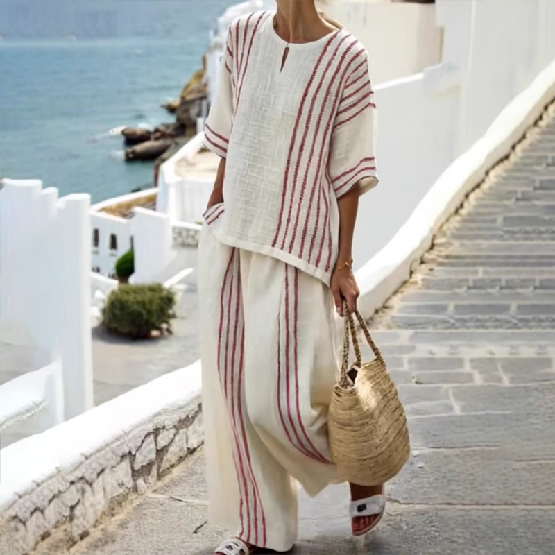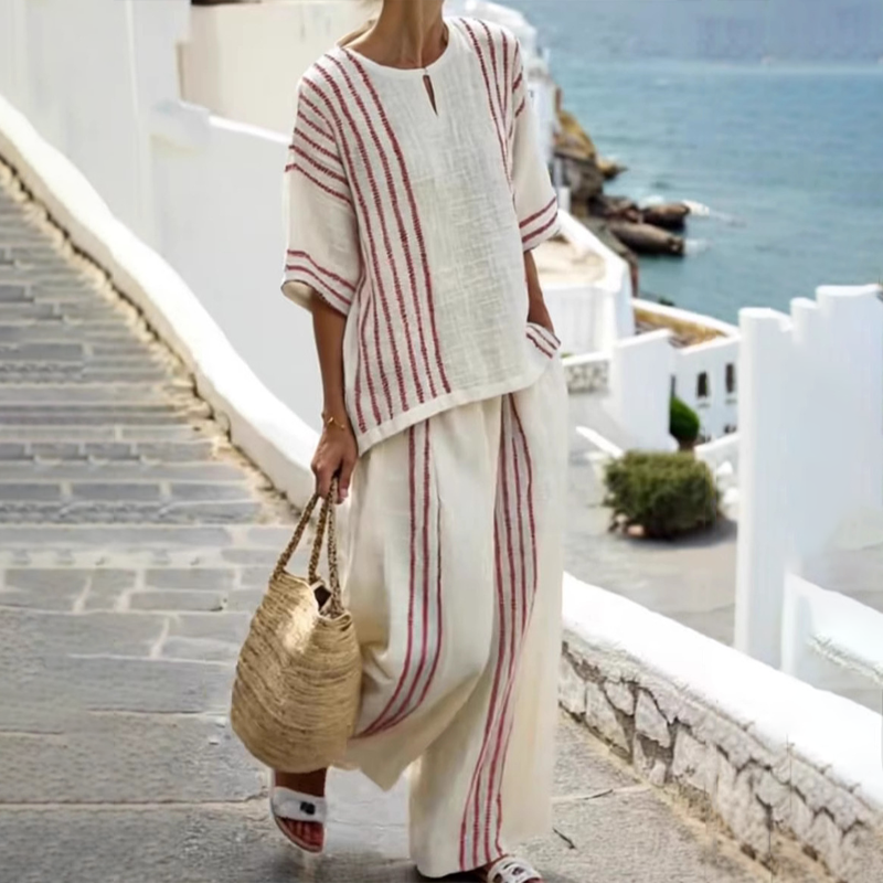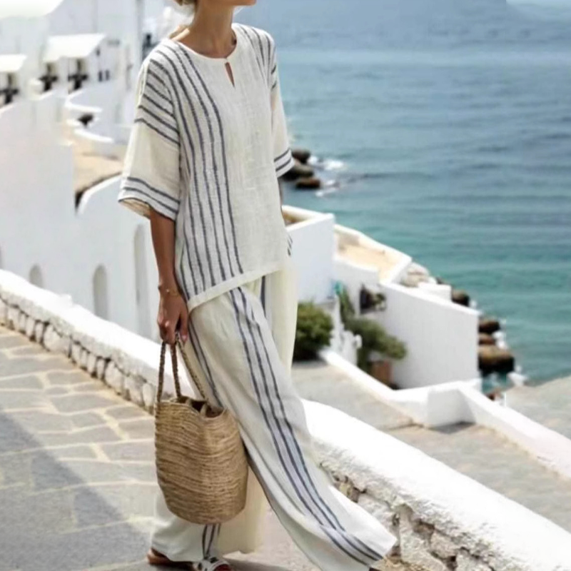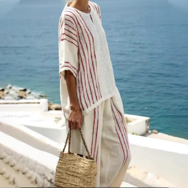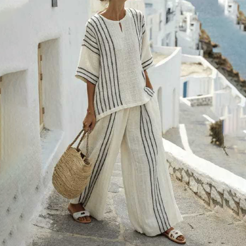 👚 SPÓJNY DESIGN W PASKI – Zarówno bluzka, jak i spodnie posiadają stylowy wzór w paski, tworząc harmonijny i przyciągający wzrok zestaw – idealny na codzienne wyjścia lub luźne spotkania z przyjaciółmi.