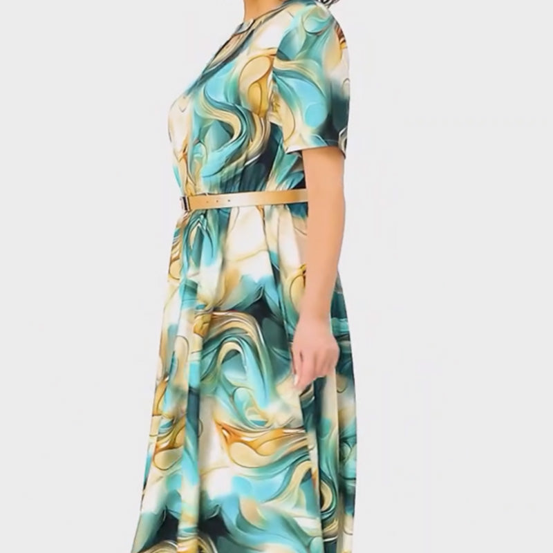 Zawartość opakowania: 1 × Elegancka damska sukienka z modnym wzorem, krótkim rękawem i paskiem