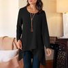 Asymetryczny dół: Ta koszulka, z krótszym przodem i dłuższym tyłem oraz bocznymi rozcięciami, przełamuje monotonię klasycznych sylwetek. Zwiewny dół elegancko faluje przy każdym kroku, delikatnie opadając na biodra i uda, podkreślając atuty sylwetki typu gruszka. Optycznie wydłuża nogi, nadając codziennym stylizacjom dynamiczny, modny charakter.