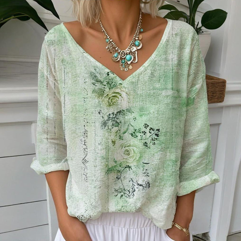 Zawartość opakowania: 1 sztuka luźnej bluzki damskiej z kołnierzem w kształcie litery V i kwiatowym nadrukiem