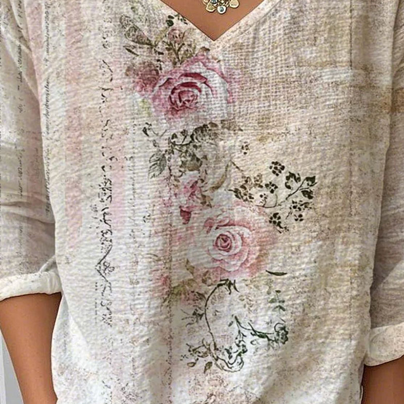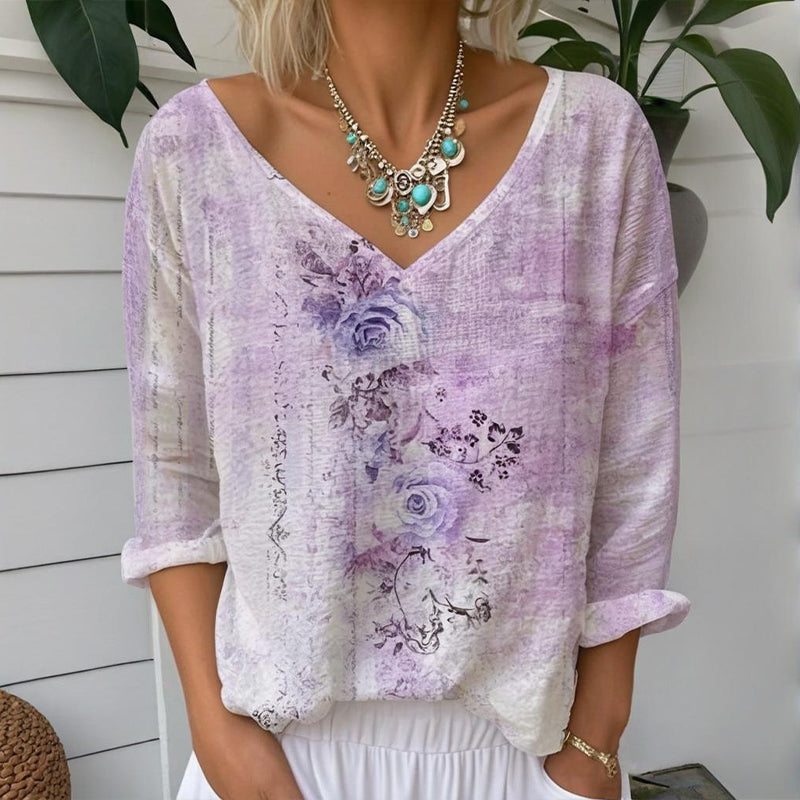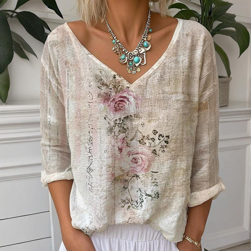 Luźna bluzka z długimi rękawami, z dekoltem w kształcie litery V i kwiat