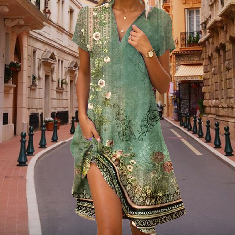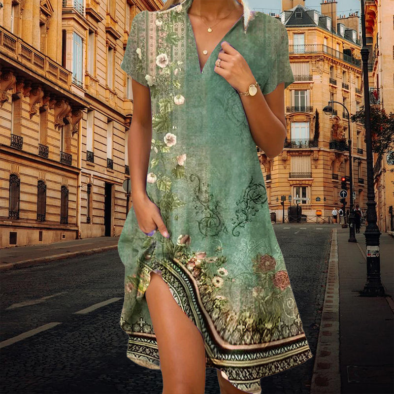 CHARAKTERYSTYCZNE NADRUKI W STYLU BOHEMY: Ta sukienka łączy elementy etniczne i w stylu country w misterne, żywe nadruki. Świeży zielony kwiatowy wzór wyróżnia się charakterem i stylem.